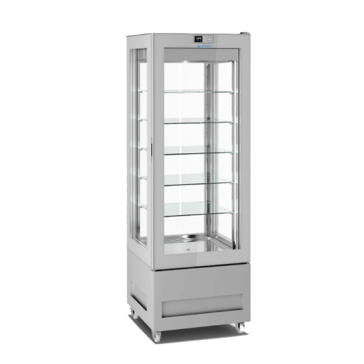 Gama de armarios expositores en cuatro caras de cristal, disponible en tres versiones: Heladería, Pastelería y No-Frost (Heladería-Pastelería)