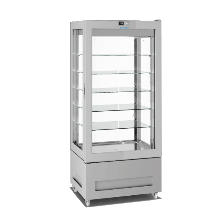 Gama de armarios expositores en cuatro caras de cristal, disponible en tres versiones: Heladería, Pastelería y No-Frost (Heladería-Pastelería)