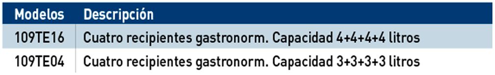Atemperador con funcionamiento de resistencias en seco. Se suministra con placa lisa para conversión de mesa caliente. Posibilidad de combinar diferentes capacidades mediante distintos modelos de recipiente. Sin mantenimiento.