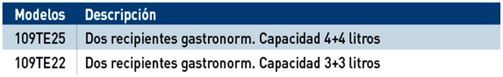 Atemperador con funcionamiento de resistencias en seco. Se suministra con placa lisa para conversión de mesa caliente. Posibilidad de combinar diferentes capacidades mediante distintos modelos de recipiente. Sin mantenimiento.