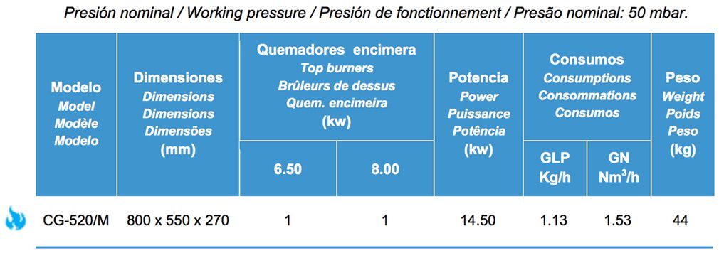 - Encimera fabricada en 1,5 mm de espesor compuesta de fuegos abiertos con piloto de encendido, válvula de seguridad y termopar.