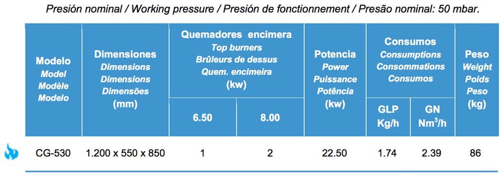 - Encimera fabricada en 1,5 mm de espesor compuesta de fuegos abiertos con piloto de encendido, válvula de seguridad y termopar.