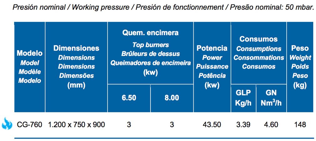 - Encimera fabricada en 2 mm de espesor compuesta de fuegos abiertos con piloto de encendido, válvula de seguridad y termopar.