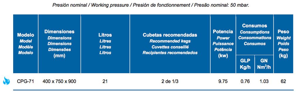 - Cuece pastas: piloto de encendido manual y con piezoeléctrico, termopar y quemador tubular bajo cuba fabricado en acero inoxidable. Mandos de control de poliamida+ABS resistentes al calor y con posiciones de piloto, máximo y mínimo.