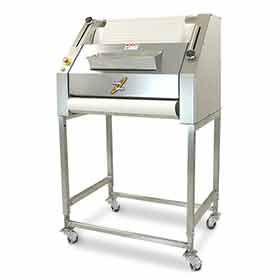 3 cilindros Ajustes mecánicos de rodamiento. y alargamiento. Alfombra de fieltro Para masa entre 50 y 1200 g. Mesa de recepción plegable. Máquina completamente en acero inoxidable