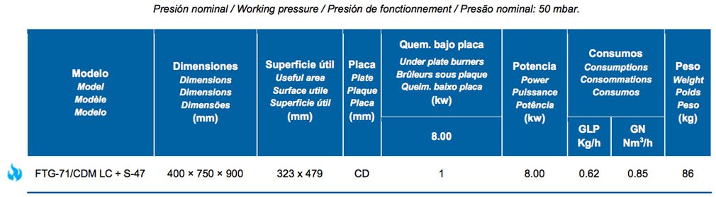 - Modelos a gas con cromo duro: piloto de encendido manual y con piezoeléctrico, termopar, regulación por válvula termostática EUROSIT de 100ºC a 285ºC y quemador tubular de gran rendimiento (70%) bajo placa fabricado en acero inoxidable. Recomendado su uso para el trabajo con pescados y verduras.