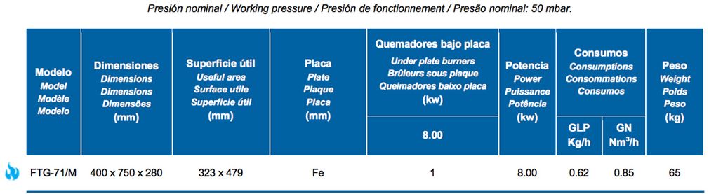- Modelos a gas con cromo duro: piloto de encendido manual y con piezoeléctrico, termopar, regulación por válvula termostática EUROSIT de 100 °C a 285 °C y quemador tubular de gran rendimiento (70%) bajo placa fabricado en acero inoxidable. Recomendado su uso para el trabajo con pescados y verduras.