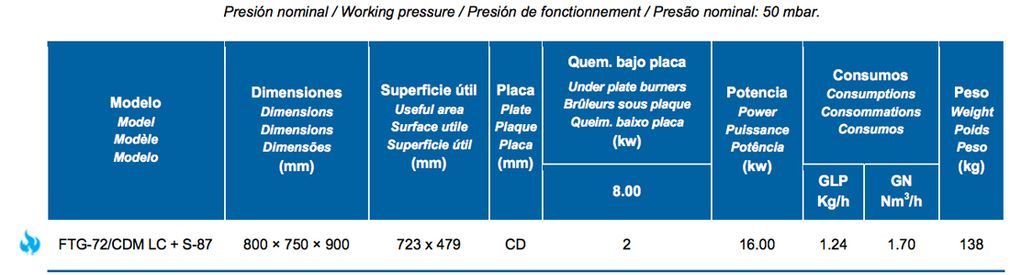 - Modelos a gas con cromo duro: piloto de encendido manual y con piezoeléctrico, termopar, regulación por válvula termostática EUROSIT de 100ºC a 285ºC y quemador tubular de gran rendimiento (70%) bajo placa fabricado en acero inoxidable. Recomendado su uso para el trabajo con pescados y verduras.