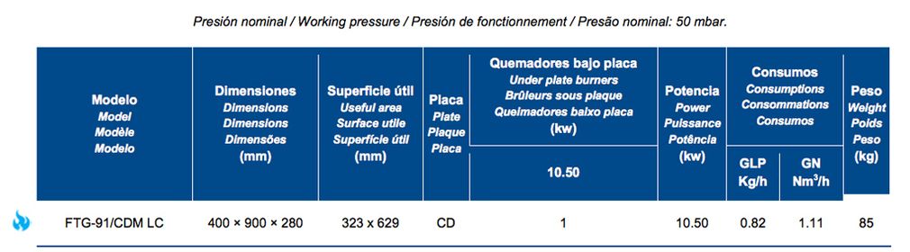 • Piloto de encendido manual y con piezoeléctrico, termopar, regulación por válvula termostática EUROSIT de 100ºC a 285ºC y quemador tubular de gran rendimiento (70%) bajo placa fabricado en acero inoxidable.