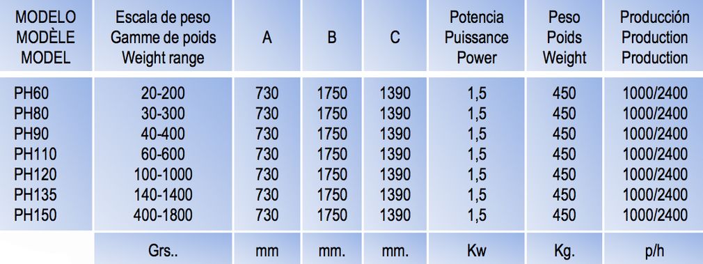 - Se fabrica desde 1 a 4 pistones con diferente escala de pesos en cada opción. - La máquina está dotada de un motor para su cinta de heñido, para mantener una velocidad constante dando un perfecto heñido. - Teja regulable para cualquier tipo de masas. Para ver todos los modelos disponibles hacer clic en la tabla.