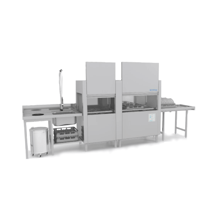 Módulo de lavado de longitud 1150mm con una cuba de 70 l y sistema de lavado de 5 brazos con bomba de lavado de doble flujo.